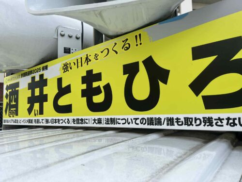 あんまり目立たないけど、選挙カーの看板に《『大麻』法制についての議論》って言葉が!