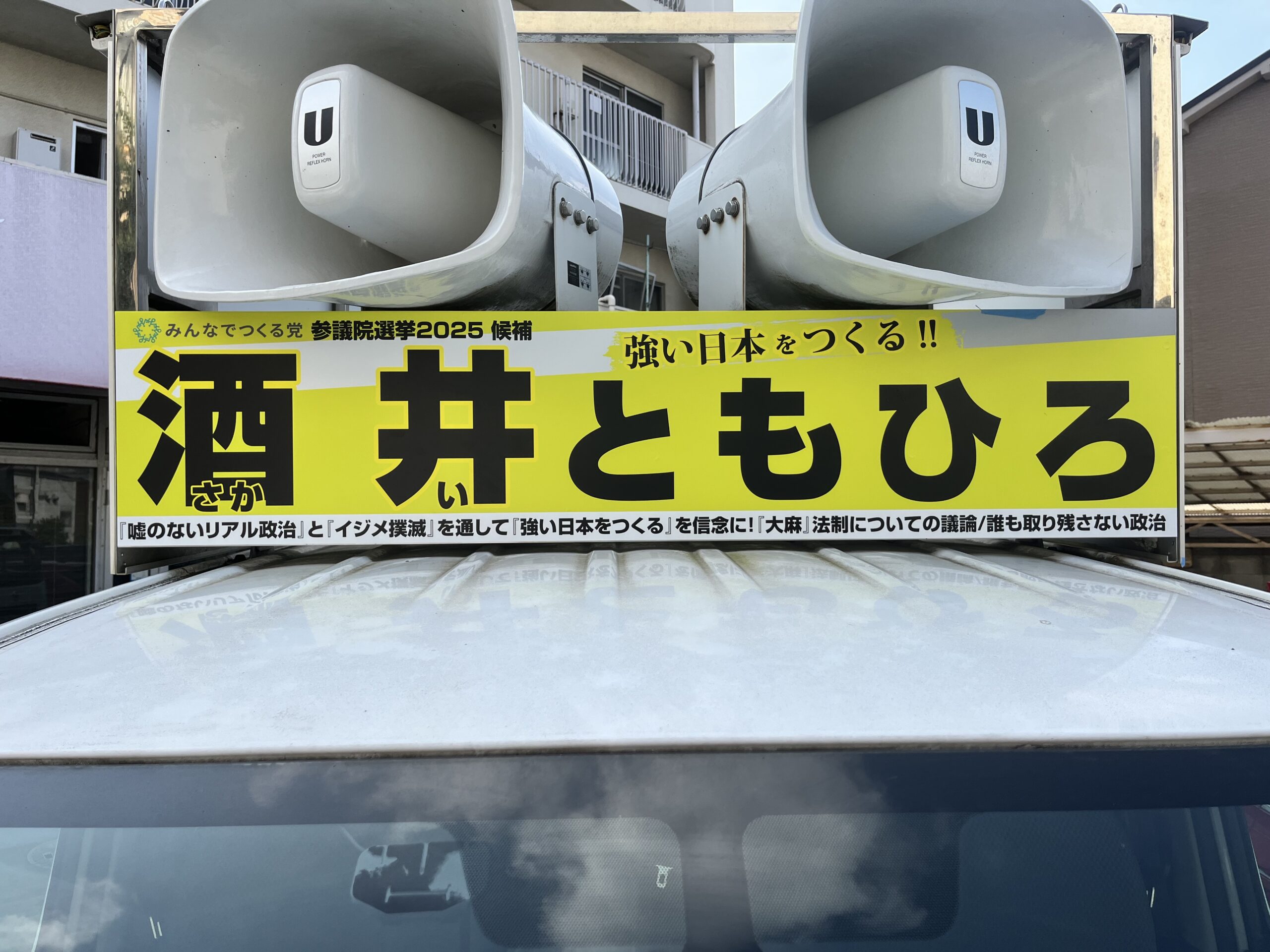 あんまり目立たないけど、選挙カーの看板に《『大麻』法制についての議論》って言葉が!