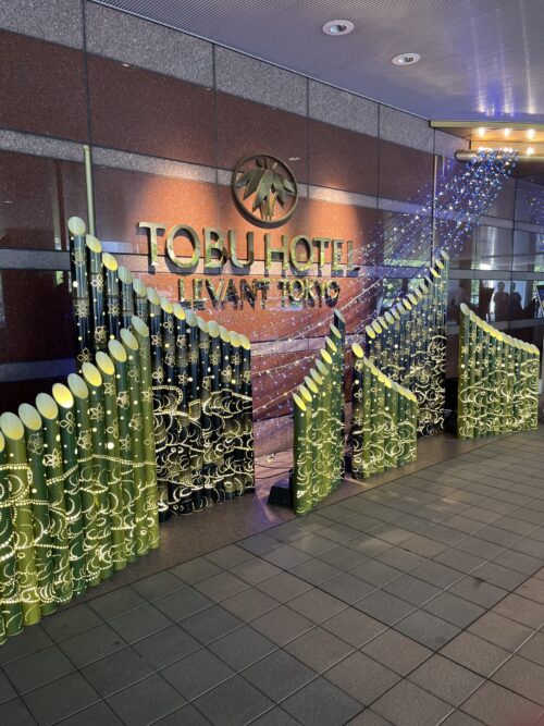 錦糸町駅ビルから直結する通路から2階の入り口へ入るところに、こんな凝った竹細工が置いてありました。