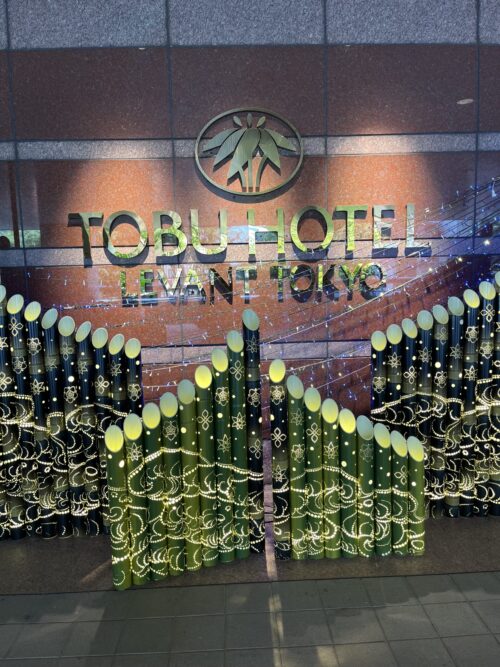 錦糸町駅ビルから直結する通路から2階の入り口へ入るところに、こんな凝った竹細工が置いてありました。