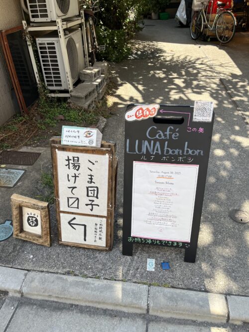 目の前まで行ってみるとガラガラ戸が普通にあるので開けて入っていくとケーキ屋さんと胡麻団子屋さんが奥と手前にあった。2階はコワーキングスペースと。