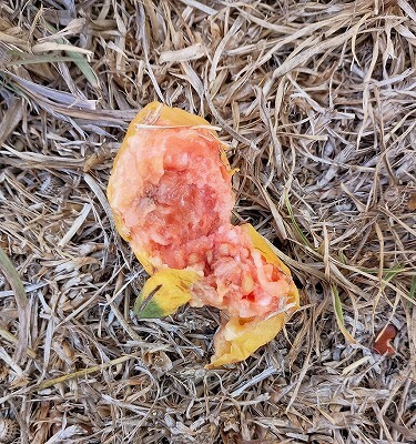 今年のは何か実がまだ痩せてるなぁ~と思って見てたのですが、そうだ、誰かいたらこないだの木のみが何か聞いてみようと思って、木のところに行ってみたんですよ。すると、いくつか熟した実が落ちて中身が見えていました。