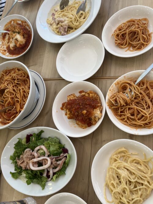 お目当てだったカプリチョーザはまさかの40組待ちで、[離れて待つボタン]を押して1時間ほどブラブラしてやっと食べれました。腹ペコで待ったのでちょっと頼みすぎてしまうのはもうしょうがないですよね。