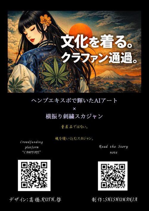 そんな〈高橋.Rurh.啓〉さんの作品を元に、日本の刺繍文化・スカジャン文化、そして日本のヘンプ文化をアートとして国内外に発信していくための最初の一歩のスカジャン。